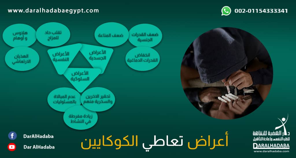 من أبرز أعراض مدمن الكوكايين هي فقدان الوزن المفاجئ وانخفاض الشهية والعرق الزائد وحرارة الجسم المرتفعة، كما قد تبدو بشرته شاحبة، وحدقة عينه متوسعة، ومظاهر جسدية إضافية مثل الأرق وعدم الحاجة إلى النوم، ونزول نزيف من الأنف أو علامات آثار الحقن، والطاقة المفرطة.